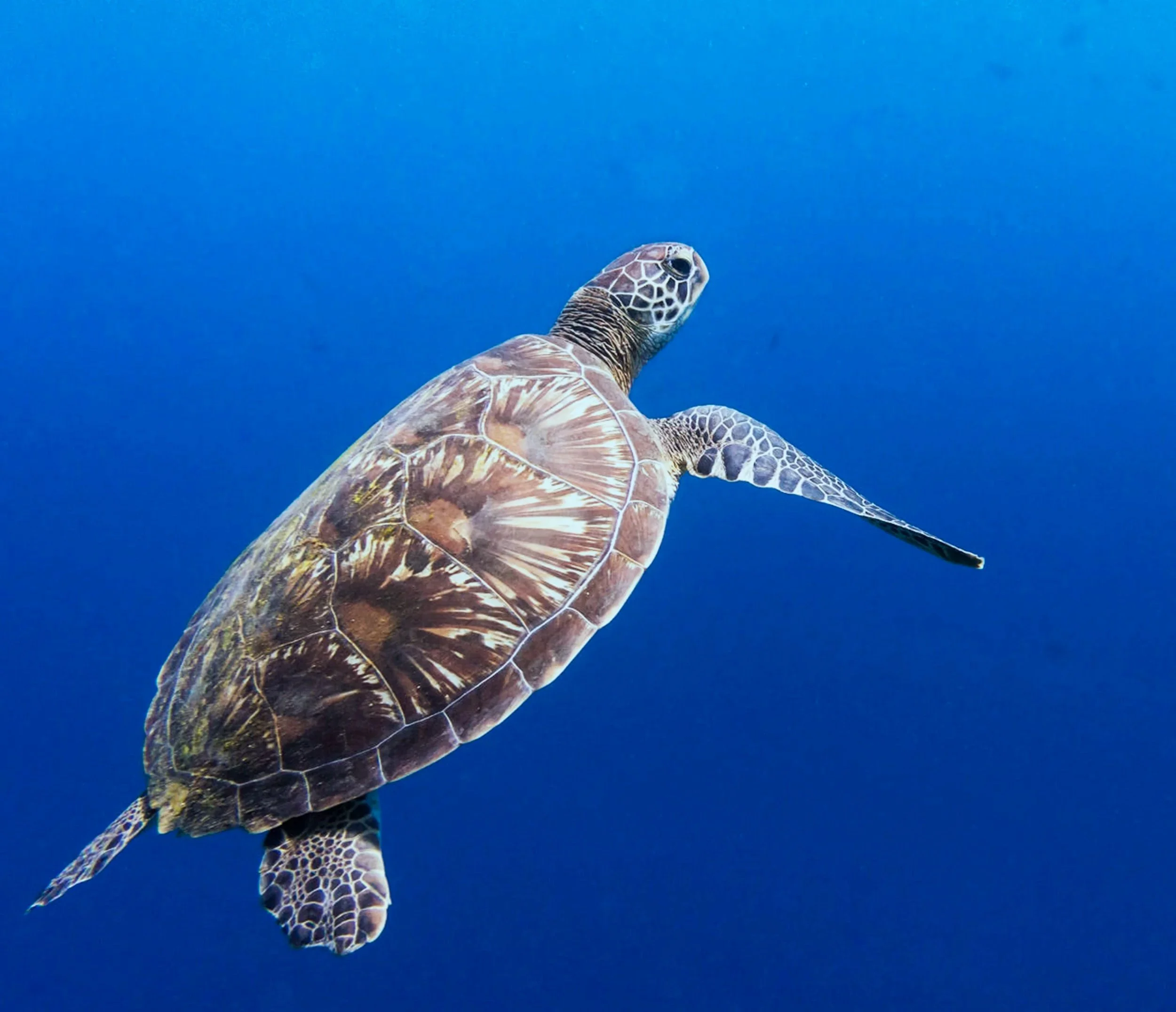 Grande tortue au corps lisse et arrondi, souvent observée en train de brouter les herbiers. Elle remonte régulièrement à la surface pour respirer.